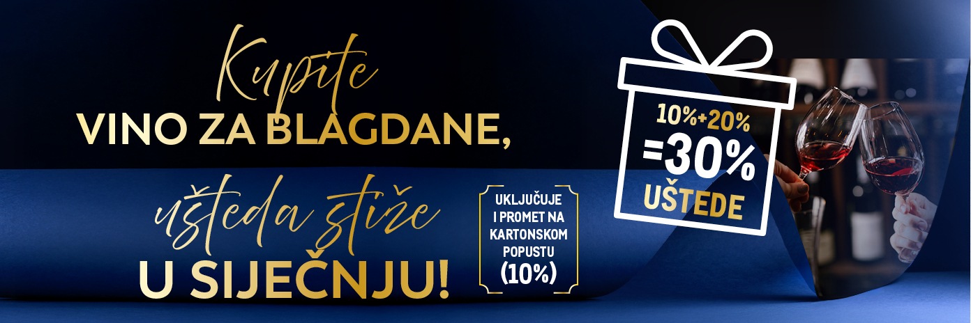 Kupnjom buteljiranih vina i pjenušaca (0,75 l) u razdoblju od 18. do 31. prosinca ostvarujete uštedu u iznosu od 30% vrijednosti kupljenih proizvoda.